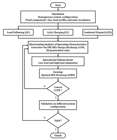 The previous control strategies, such as LF, CC, and CD, were analyzed at the homogenous system configuration to investigate their vulnerabilities. The operating characteristics at similar load profiles, solar irradiances, and component sizes were examined. The analysis results were then used to develop an enhanced control strategy that deals with the other’s weaknesses. First, the LF, CC, and CD control strategies were simulated at the same load profile, solar irradiance, and the components’ size (PV System, BES, and diesel generator). The annual operational characteristics, such as the schedule of generator operation and the BES charge/discharge, were analyzed to find the weaknesses. It was found that the existing control strategies sometimes simultaneously operate the generator with the BES, which causes a lower operating efficiency of the generator. Furthermore, it was observed that there was an idle operation of the BES for quite a long period, which caused a higher cost of using storage. In addition, the CC and CD control strategies tended to have the BES in full condition when there is excess power generated by the PV system so that there was wasted energy. The research framework is presented in Figure 4.