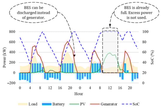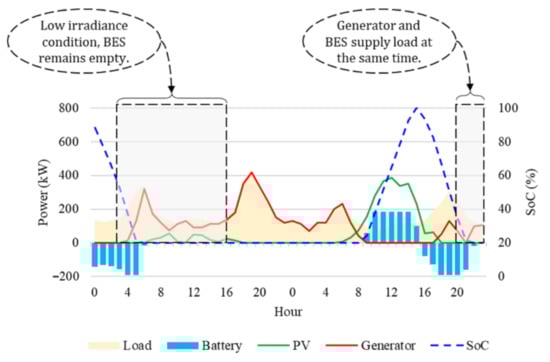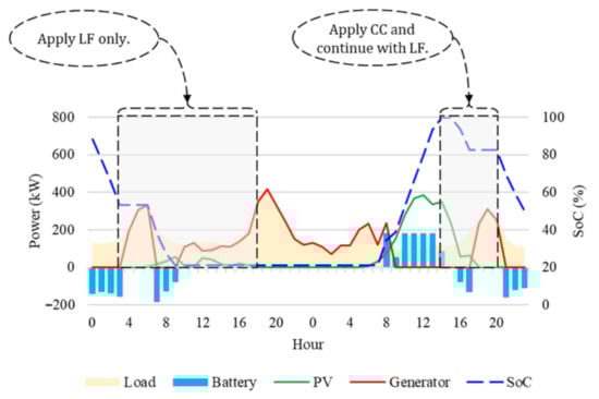 On the other hand, the combination of LF and CC control strategies, the so-called CD control strategy, delivers more efficient results. It was considered the most optimized control strategy []. The CD control strategy tends to charge the battery in two conditions: using the excess power from the PV system and using the generator during the low load period. The first one follows the logic of the LF control strategy, while the latter works based on the algorithm of the CC control strategy. This strategy does not use the generator to charge the battery during the high load period simultaneously. The CD control strategy commands the BES discharging when the BES’s SOC is at maximum setpoint, or the BES has been discharged in the previous timestep (as in the CC control strategy), or the BES can supplement the unmet power generated by the PV system (as in the LF control strategy). The analysis of the CC control strategy operation is illustrated in Figure 7.
