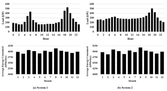 Load profiles of System-1 and System-2. The deviation between peak load and the hourly average load in System-1 was greater than in System-2.