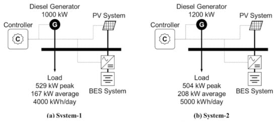 Configuration of the hybrid power generation system. Both systems have typical configurations but with different characteristics. System-1 with a higher peak load had a lower generator capacity than System-2.