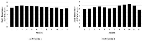 The profile of solar irradiance in both locations is provided in Figure 11. The average solar irradiance in the System-1 location was 4.8 kWh/m2/day, and in the System-2 location was 5.6 kWh/m2/day. The maximum energy per day occurred in March (5.17 kWh/m2/day) and in October (6.5 kWh/m2/day) for System-1 and System-2, respectively.