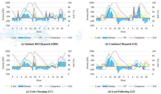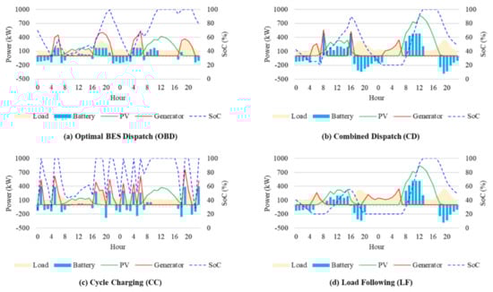 The CC control strategy tended to run the generator continuously to charge the battery until it reaches its SOC setting point once it starts to operate. The battery would only be discharged if discharged in the previous timestep or at maximum SOC. This strategy might result in the condition such as the battery is already fully charged when the PV system generates excess power. Consequently, the battery may remain at maximum SOC for some periods. Hence, the BES was also not optimally utilized when the CC control strategy was applied, as shown in Figure 6.