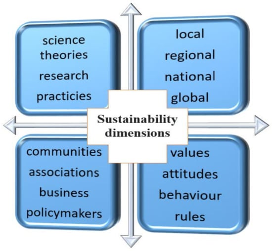 Climate changes stimulated by the increased anthropogenic impact on the environment induce effective propagation and implementation of new methods in energy management. T.R. Burns [1] (p. 1127) indicated the crucial “drivers” of environmental change such as extensive environmental sources consumption, increased garbage, air pollution, biodiversity loss. He outlined the tremendous acceleration in scale and pace of those human impacts last decades and the significance the “sustainability revolution”—sustainalization” that implies the whole society [1] (p. 1128). The sustainability process involves many dimensions: local, regional, national and global scale. Concerns communities, associations, business, federal authorities, policymakers. It reflects human behaviour; attitudes, values change and setting the new rules to follow. It also takes place in science and practice (see Figure 1).