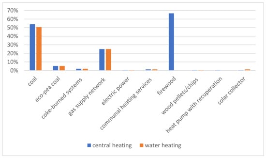 Eight households used eco-pea coal for central heating and usable water heating, with three more households using coke-burned systems for the same purposes. The gas supply network was a source of house and water heating for 38 representatives of the homo energeticus segment. One household used electric power as a source of house and water heating. Communal heating services were used by two households.