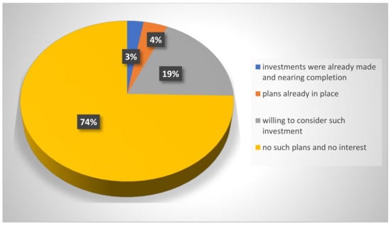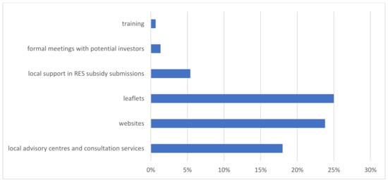 Reasons for the poor knowledge of RES may be derived from the next query, with the following phrasing: “Please provide examples of parish/district support for the public in relation to RES”. Six variants of answers were provided, with a space to add their reply. Respondents could point to more than one answer (multi-select questions). In this case, 26 respondents brought up the context of local advisory centres and consultation services (nearly 18%). Here, 35 answers (23.8%) emphasised the dissemination of information on parish/district websites, 37 responses (25%) chose to emphasise leaflets, eight more (5.4%) subscribed to the answer related to local support in RES subsidy submissions. Only two respondents brought up the argument of formal meetings with potential investors, and only one respondent chose to emphasise training. Concluding either the respondents are not adequately informed of the available forms of education or that such education is not adequately provided (see Figure 5).
