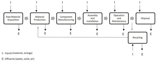 Although photovoltaics is a source of renewable energy, the total environmental impact must be assessed throughout the entire life cycle of the system [,,]. Photovoltaic modules at the end-of-life stage constitute an inevitable waste stream. The typical lifespan for PV modules is about 25–30 years.
