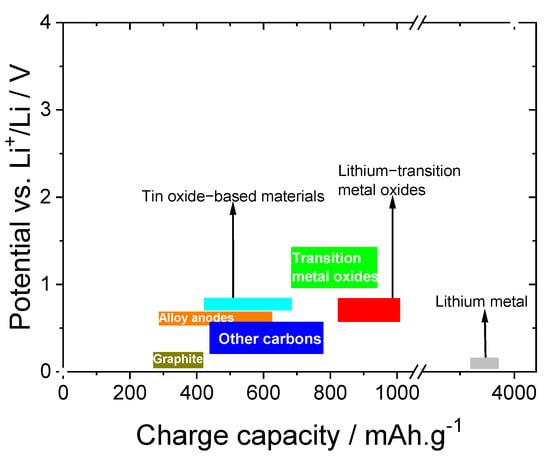 In addition to the gravimetric and volumetric capacities of each anode active material, other parameters, such as the average voltage range, porosity, and irreversible capacity loss are relevant in determining the performance of the anode. Typically, the main active materials for the anode are carbonaceous materials, alloys based on Si, Sn, Al, Ga, Ge, Pb, and Sb, metal oxides, and metal chalcogenides, among others. Figure 2 shows the voltage range vs. Li/Li+ as a function of charge capacity of these anode active materials [59,60].