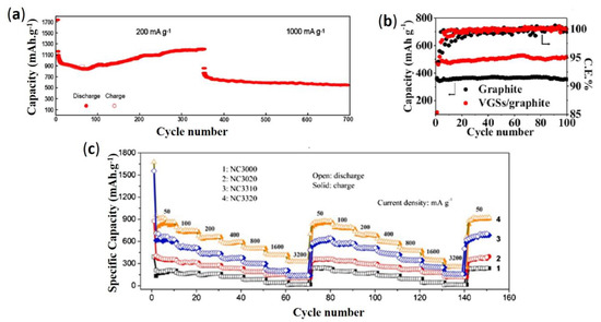 (a) Long-term cycling performance of CoCl2-FeCl3-GICs at 200 and 1000 mA·g−1 [66]. (b) Cycling curves of graphite and vertical graphene sheets (VGSs)/graphite at 0.2 C [67]. (c) Rate performance at various current densities for the different nitrogen-doped graphene-like carbon nanosheets samples [68].