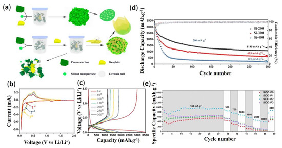 (a) Schematic illustration of the preparation process of amorphous carbon-coated silicon [74], (b) CV curves of Si-200 at a scan rate of 0.1 mV·s−1; (c) Galvanostatic discharge/charge profiles of Si-200 at 0.2 A·g−1; (d) Cycling performance of various nano-Si at 0.2 A·g−1 [81]; and (e) Rate capability of the different silicon oxycarbide (SiOC) samples measured at various C-rates from 180 to 3600 mA·g−1 [82].