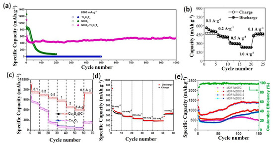 (a) Cycling performance of MoS3-Ti3C2Tx at 2000 mA·g−1 [115], (b) Rate capability of CoO/Co1.94P@CP [116], (c) Rate performance of Co3O4@C and bare Co3O4 at various current densities from 0.1 to 5 A·g−1 in the voltage range of 0.01–3.0 V [117], (d) Rate performance of TiO2/C composite-fibers electrode at various current densities from 50 mA·g−1 to 500 mA·g−1 over 10 cycles [118], and (e) Cycling tests of MOF-MnO/C and MOF-MZO/C electrodes at 0.2 A·g−1 [119].