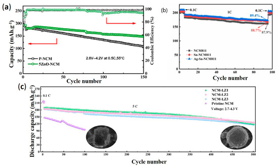 (a) Cyclic performance at 55 °C of NCM and 5ZnO-NCM [150], (b) Cycling performance of NCM811, Sn-NCM811, and Ag-Sn-NCM811 (1 C = 200 mA·g−1, at the range of 2.8–4.3 V) [151], and (c) Cycling performance of the a La2Zr2O7-coated NCM samples at 5 C [153].