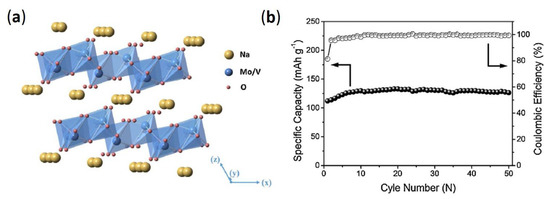 Other cathode active materials without lithium in their structure have been studied as an alternative of the conventional lithium cathode active materials. In this case, the source of lithium ions is the lithium metal used as anode. The electrode material NaVMoO6 with a layered structure has been found with the highest valence states for vanadium (+5) and molybdenum (+6), which are suitable for cathode active material for LIBs, their structure and performance being shown in Figure 7a,b, respectively [179].