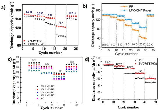 (a) Discharge C-rate capabilities of cells with Celgard 2400 separator and CFs/PPS-1/1 separator [212], (b) Rate capability of LFP half cells with PP and LPC-CNF paper separators at different current densities [231], (c) Rate capability of LFP half-cells with BC and ANFs/BC separators [200], and (d) Rate capabilities of LFP half cells using PE and PVDF/TPP/CA membranes [237].
