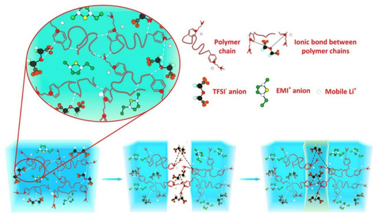 - Tian, X.; Yang, P.; Yi, Y.; Liu, P.; Wang, T.; Shu, C.; Qu, L.; Tang, W.; Zhang, Y.; Li, M.; et al. Self-healing and high stretchable polymer electrolytes based on ionic bonds with high conductivity for lithium batteries. J. Power Sources 2020, 450, 227629. [Google Scholar] [CrossRef]