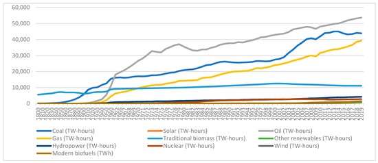 During the last two centuries (Figure 1), decreases in energy demand due to different crises can be observed: 1973, OPEC oil price shock; 1979, energy crisis; 2007–2009, financial crisis [41]. The energy demand increased during and after the two world wars (1916–1918, 1939–1945).
