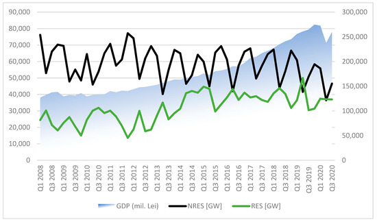 Quarterly GDP and electricity from RESs and NRESs, between Q1 2008 and Q3 2020. Own representation adapted from data [50,53].