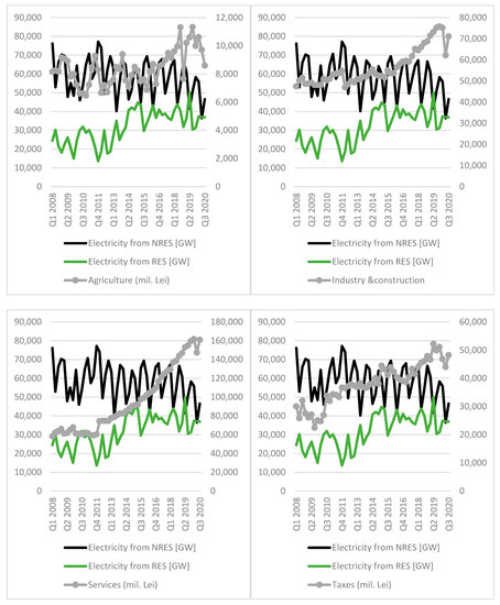 Until 2008, Romanian GDP was correlated with the level of electricity consumption: the causality runs from electricity consumption to economic growth [11]. Figure 2 shows the trends in total produced electricity and in electricity that comes from RESs and NRESs, compared with the GDP. The electricity that comes from RESs increased similar to the GDP, while the electricity from NRESs decreased. When calculating the Pearson coefficient, the data demonstrate a strong positive correlation between electricity that comes from RESs and GDP (r = 0.611, sig. = 0.000) (Table 3). There is no correlation between GDP and electricity that comes from NRESs for the period Q1 2008–Q3 2020.