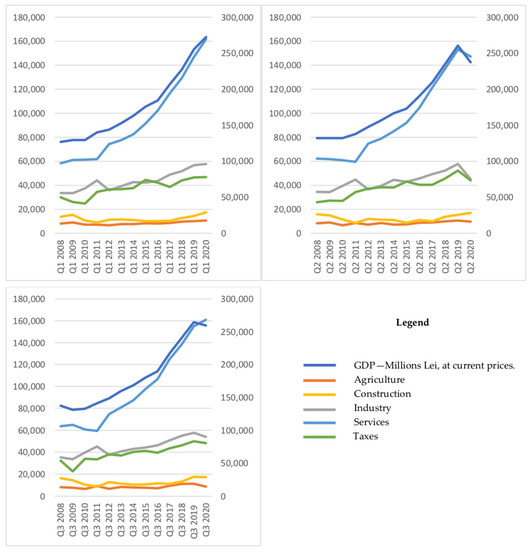 During the COVID-19 pandemic, the GDP decreased from 272,475.2 million lei in the first quarter of 2020 to 237,422.4 million lei in the second quarter of 2020 (Figure 4). It was the biggest fall in the last 20 years. The reasons behind the decrease in the GDP are linked with the imposed lockdown, along with all the measures described in Table 1.