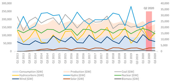 Comparative analysis of generation and consumption of electricity from different fuels in Romania, from Q1, Q2, and Q3 2013–2020. Source: calculation of quarterly production of electricity, from official data [52].