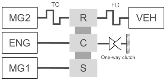 The target vehicle in this study is the power-split hybrid system shown in Figure 1. The planetary gear as a power-split device is connected to the engine and motors and drive shaft, respectively. This power-split powertrain has been improved upon from one of the most well-known systems, the Toyota Hybrid System (THS) [18,19]. This version has been improved by the addition of a one-way clutch to the carrier of the planetary gear, which enables the generator to assist the drive force, unlike in the previous version [20]. Table 1 lists the vehicle specification data used in this study. We obtained this data and vehicle model from Autonomie, a simulation tool developed by Argonne National Laboratory(Lemont, United States) [21,22]. Because of the layout of the Autonomie program we used, we call some specific components by abbreviations for general components. For instance, the planetary gear as the power-split device is called GB, which stands for gearbox, because the planetary gear performs the role of a gearbox in that it transmits engine power to the drive shaft. The motor reduction gear is called TC, which stands for torque coupling, and the final drive reduction gear is called FD. In 2019, we tested and validated the vehicle model and controller model with the test data [23].