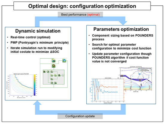 In this study, the component-sizing optimization process was developed by applying PMP and POUNDERS to the EMS and component-sizing algorithm, respectively, in a forward-looking simulation framework. For the initial parameter, we calculated the fuel consumption using the forward-looking simulation model to which PMP is applied; and through these results, the POUNDERS algorithm updates the parameter to find the optimum value shown in Figure 2. While repeating this process, the process terminates when the parameter converges or the iteration exceeds the maximum value.