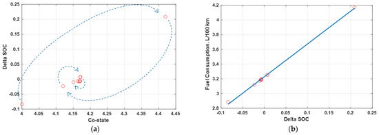 Since the initial costate in PMP has great influence on the final SOC, it is important to find the initial costate that matches the final SOC with the initial SOC in the HEVs. To this end, we iterate the simulation in the parameter set determined by POUNDERS, in order to find the initial costate that makes the SOC deviation close to 0. It is terminated when it converges below a certain tolerance or reaches the maximum number of iterations. If it is terminated due to the maximum iteration number, fuel consumption is estimated through linear approximation, as shown in Figure 3.