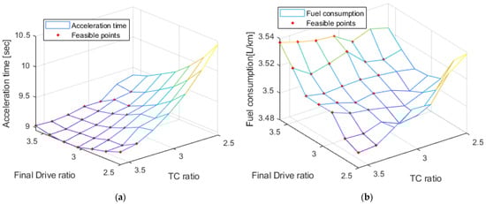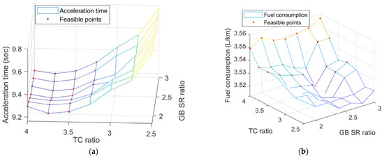 Results on entire range of versus TC and FD and feasible points: (a) acceleration results; and (b) fuel consumption results.
