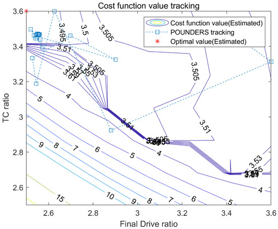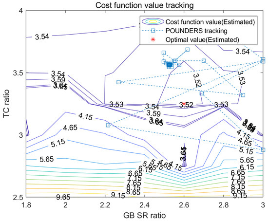 The result of component-sizing optimization for Case 1 follows. Figure 4 shows the resulting values of acceleration time and fuel consumption within a given parameter range in the proposed component-sizing optimization process. By dividing each parameter range by seven points, a total of 49 points were obtained. In order to confirm the optimization performance of the POUNDERS algorithm, we obtained fuel consumption and acceleration performance results in all domains for only two parameter cases. As required constraints, points that satisfy the acceleration time and profile speed of the driving cycle speed are indicated as feasible points. As Figure 4a shows, the GB value does not have a significant effect on the acceleration performance, and the larger the TC value, the better the acceleration performance. When the value of the TC ratio acting as the reduction gear ratio of the motor is large, the torque increases during the initial acceleration situation, and the acceleration performance tends to be improved. Figure 5. Cost function value contour and parameter optimization history versus TC and GB. shows the optimization history through the component-sizing process using POUNDERS. In order to confirm the optimality of the POUNDERS result, the value of the cost function h(r, s) is derived in Figure 5 through Equation (8) using the fuel consumption values in Figure 4b and the acceleration time value in Figure 4a. The optimized values are 2.525 and 3.563 for the GB and TC ratios, respectively (Figure 6). Table 3 shows the optimized parameter values for Case 1, and Table 4 summarizes the fuel consumption results, SOC changes, and acceleration performance results for all cases. To adjust the fuel consumption results resulting from the SOC difference, the adjusted fuel consumption was calculated by interpolation using linear approximation as described in Figure 3. The fuel consumption for Case 1 is 3.511 L/100 km for the combined cycle, which is an improvement compared to 3.527 L/100 km for the non-sized case.