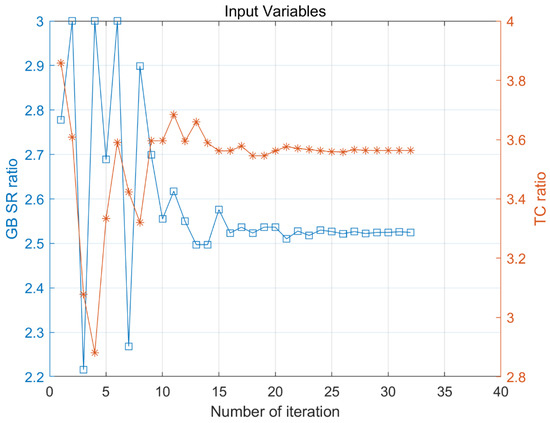 Optimization results for the TC(orange, asterisk) and GB(blue, cube) ratios.