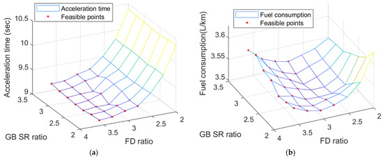 Results on entire range versus GB and FD and feasible points: (a) acceleration results; and (b) fuel consumption results.