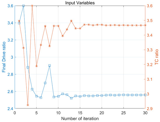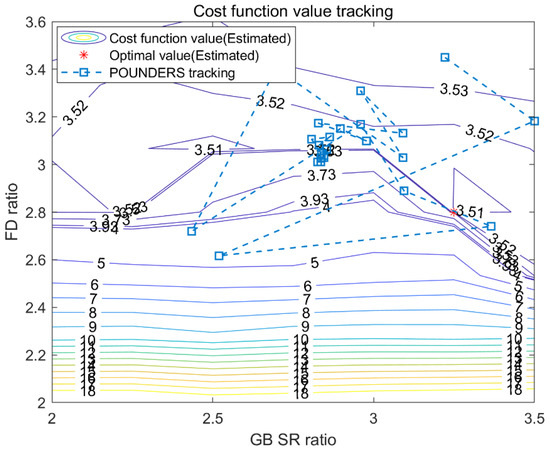 The result of parameter optimization in Case 2 is as follows. As with Case 1, Figure 7 shows the 49 acceleration time (a) and fuel consumption (b) results in the entire parameter range, and Figure 8 shows the cost function value and tracking history of the optimization process in all areas. Similar to Case 1, the GB value does not have a significant effect on the acceleration performance, and the results show that the larger the FD value, the better the acceleration performance. Not only the TC value but also the FD value should be large so that the wheel torque increases during the initial acceleration, and the acceleration performance tends to be improved. The optimized values are 2.838 and 3.028 for the GB and FD ratios, respectively (Figure 9). Table 4 and Table 5 show the optimized parameter values for Case 2 and fuel consumption results for all cases, respectively. The fuel consumption is 3.505 L/100 km for combined cycle, which is an improvement compared to 3.527 L/100 km for the non-sized case.