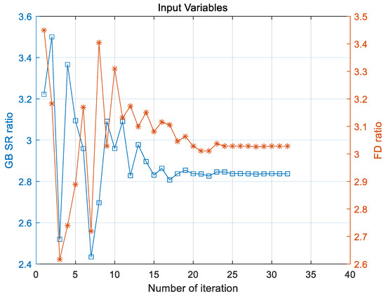 First, component-sizing optimization was performed for three cases in which two out of three parameters were paired. The objective is to find the optimal values of a parameter set for the three gear ratios—GB, TC, and FD—that minimizes fuel consumption. Table 2 shows the parameter combinations and ranges of the three cases. For example, in Case 1, the optimal values of GB and TC that minimize fuel consumption are found, and the FD value, which is not a target parameter, is fixed as the original value from Table 1. The two-parameter optimization case was performed as a preliminary task to confirm the optimization performance of the sizing algorithm and to determine the range in the three-parameter optimization case. For this, we set parameter ranges that best show the algorithm’s optimization performance and trend.