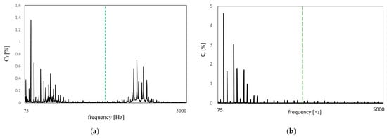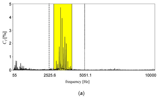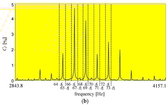 Exemplary waveform of supply voltage; (a) the analysed frequency sub-band is marked with yellow; the dashed line marks the frequency of the 50th harmonic whereas the dotted line marks the frequency of the 100th harmonic; (b) the extended frequency sub-band 2843.8–4157.1 Hz is marked with yellow; the dashed lines mark the harmonic frequencies as integer multiples of the fundamental frequency equal to 50.51 Hz []. Cf is the content of higher frequency components in relation to fundamental voltage, both: harmonics and interharmonics.
