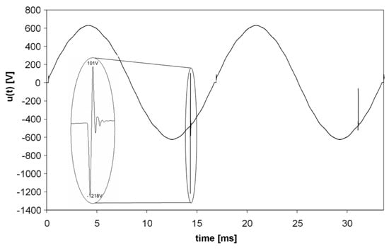 According to a Marine Accident Investigation Branch report [], ‘Monitoring equipment should be capable of detecting transient voltage spikes’. Unfortunately, this recommendation was not included in the Unified Requirements of IACS, as only the requirement for continuously monitoring the THD factor was introduced [], despite voltage spikes also being present in maritime microgrids. The occurrence of these spikes on shipboards is related to switching generators, harmonic filters and large receivers on and off as well as malfunctioning power-electronic equipment. The consequences of these spikes can be dangerous for ships, crew and the environment. For instance, the possible reason for the harmonic filter failure aboard Queen Mary II was ‘being exposed to frequent voltage transients due to increased number of switching cycles’ []. A similar situation was observed aboard a chemical tanker; due to a malfunction in the automatic voltage regulator (AVR), the random transient was observed during idle run of the generator with rated power of 1062 kVA, an example of which is shown in Figure 5. The rated voltage was equal to 440 V and rated frequency to 60 Hz. The voltage waveform was registered with sampling frequency equal to 150,375 Hz in the frequency band up to 50 kHz (cut-off frequency of anti-aliasing filter). It must be stressed that the phenomena are usually hard to capture and determining their magnitude strongly depends on frequency bandwidth of registering device.
