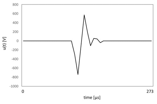 where the sk is an instantaneous sample of the extracted transient signal, sk−1 is the previous sample and tr1 and tr2 are threshold values. If condition (5) has the logical value ‘true’, then an impulse occurs. The simplicity of the formula allows fast, real-time transient detection, in fact starting and ending points of spike. This is the necessary condition for determining a number of transient spike indices, e.g., duration, energy. The threshold values tr1 and tr2 were chosen after experimental investigation in maritime microgrids, as tr1 = 0.2Vn and tr2 = 0.06Vn, where Vn is the nominal voltage amplitude []. The results of the application of the proposed solution for the transient depicted in Figure 5 is graphically presented in Figure 6.