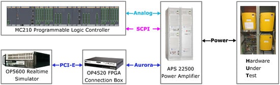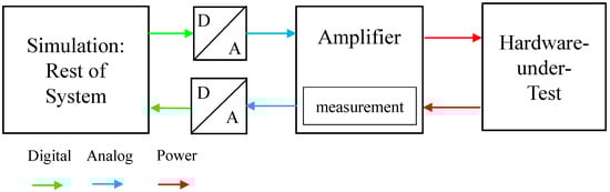 The HUT is connected with the power amplifier, which reproduces the simulated conditions at the HUT. Measured quantities from the HUT are then fed back to the simulation, which reacts to the measurement. Most signals transmitted between different devices can either be part of the test system or part of the HUT itself.