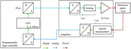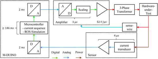 As explained in the case example in Section 4.1, most PHiL setups require a high-performance RTS, but the PHiLsLAB can also be used to test hardware for high current applications with basic simulation hardware. The investigation of current durability of welded or other connections using a current driven measurement setup is presented in this case example. Analogous to the case example in Section 4.2, the internal oscillators of the linear amplifier are used. The used setup and time delays are shown in Figure 12. A basic industrial M-DUINO microcontroller of type M-DUINO 38R+ programmed in C with the Arduino IDE is used for simulating the ROS and controlling the power amplifier. Scaling the power amplifier input is possible, if necessary due to damping and inaccuracies. In the amplifier, the analog input signal is first converted into a digital signal and then triggers an amplitude modulation of the set signal. The current root mean square value, frequency, and phase are preset for this signal; the amplifier is working in current controlled mode and high currents of up to 800 A can be transmitted to the HUT.
