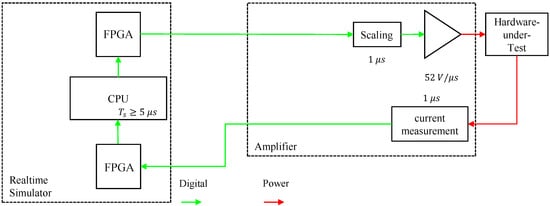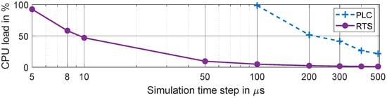 Depending on the dynamics of the model, the simulation in an RTS is either CPU-based or field-programmable-gate-array (FPGA)-based. A CPU simulation allows for more complex systems, but the simulation time step is limited to 5–10 μs depending on the hardware. A FPGA-based simulation allows for lower time steps and therefore a higher dynamic of the simulated systems. Due to the limited computational capacity of FPGAs, the simulated systems have to be smaller [,].