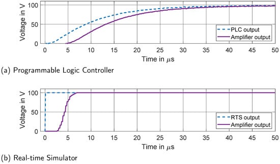 The results for both simulators are shown in Figure 6. It can be seen that the analog output of the PLC (Figure 6a) needs about 25 μs to rise from 10% to 90%. With a delay of approximately 5 μs, the amplifier output follows the input. One can see that the total delay between the simulated value and the amplifier output is dominated by the rise time of the PLC output.