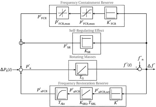 The dynamic frequency behavior of the interconnected grid model can thus be represented in a simplified way by a feedback integrator (Figure 7). The integrator represents the storage of the energy of the rotating turbine generator system with the grid time constant . The feedback of the frequency deviation is represented by the self-regulation effect , the FCR , and the aFRR . Quantities marked with an asterisk are related to the grid load and the nominal frequency .
