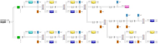Comparing the CPU loads for both simulators, it can be seen that the performance of the RTS exceeds the PLC. For the same CPU load, the RTS is able to calculate the model about 20 times as fast as the PLC. This shows that a dedicated RTS is needed if either low time steps or a high model complexity is required. The model simulated in this example is fairly simple, i.e., just containing a source, a transformer, and a few lines. Figure 9 shows a Simulink model of a 14-node Cigre middle voltage grid []. This model is simulated on the RTS with a time step of 100 μs and an average CPU load of 67%. Simulating such a model on the PLC with an appropriate time step is not possible.