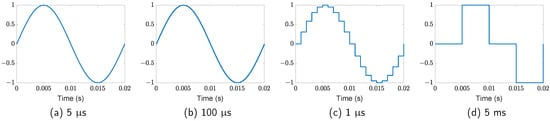 Discretised sinusoidal signal with a time step of 5 μs (a), 100 μs (b), 1 ms (c), and 5 ms (d).