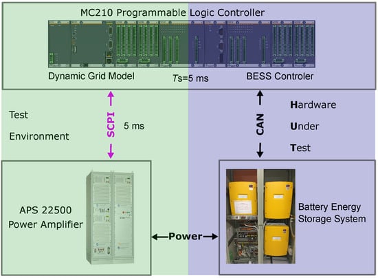 The experimental set up is shown in Figure 11. The HUT is the BESS controller, also implemented in the PLC, and the BESS itself (Figure 11, purple background). The BESS consists of three bidirectional inverters and a lithium-ion phosphate accumulator with a capacity of 20 kWh. The BESS is connected to the three-phase grid build by the power amplifier. The active power is measured by the internal meter of the amplifier and transferred by SCPI to the PLC. The frequency is measured by an external power meter and is also transferred to the PLC.