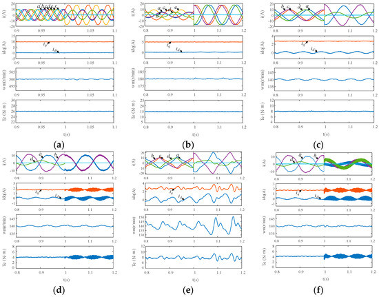 Figure 10. Simulation results. (a) From normal operation to Phase f open fault with dual current loops control. (b) From Phase f open to Phases e, f open fault with dual current loops control. (c) From Phases e, f open to Phases c, e, f open fault with dual current loops control. (d) From Phases c, e, f open fault without neutral point current to Phases c, d, e, f open fault with dual current loops control. (e) From Phases e, f open to Phases c, e, f open fault with traditional current control. (f) Phases c, e, f open fault from “no-neutral-current strategy” to “neutral-current strategy” with dual current loops control.