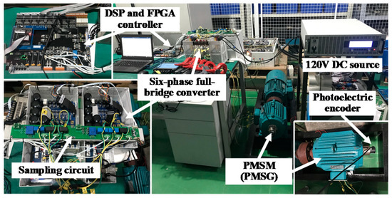 The 6P-PMSM with three pole pairs are connected to another same PMSM, which works as a generator with three power resistors of 10 Ω as the load. Two three-phase inverters are controlled by the digital controller of TMS320F28335 DSP. The experimental system is charged by a 340 V DC source which can provide the power of 3.4 kW at most. Combining the power of the DC source and the PMSM, electric speed reference of the PMSM are set as 500 r/min.