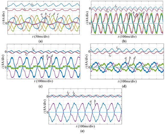 Figure 13. Experimental results under dual current loops control: (a) Phase f open fault. (b) Phases e and f open fault. (c) Phases c, e and f open fault without neutral point current. (d) Phases c, e and f open fault with neutral point current. (e) Phases c, d, e and f open fault.