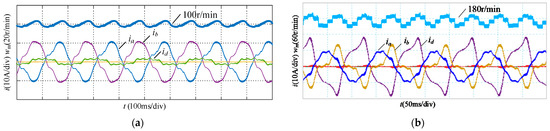 When the PMSM works as 500 r/min, the normal phase currents are about 5.6 A. Hence, to protect the facility, the maximum phase current under different fault cases is limited to 8.5 A. According to the analysis in Section 5, maximum of phase currents rises for providing the same torque with the phases less, so with the fixed phase current limit, the output torque of the PMSM decreases as the working phases reduce. According to (11), the torque is proportional to iq, so iq decreases as well. Figure 13c,d are the experimental results under three-phase open fault with the different control strategies. Figure 13c is without the neutral point current and Figure 13d is with the neutral point current, which outputs the same torque. As can be seen, the amplitude of phase currents in Figure 13d is much smaller than that in Figure 13c, which proves the reduction effect on the phase currents of the strategy with neutral point current. Figure 13e is the waveforms under four-phase open fault with the neutral point current. Compared with the three-phase open fault with the neutral point current, the amplitude of phase currents increases, which proves the analysis and the simulation result as well.