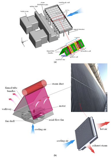 - Huang, X.; Chen, L.; Kong, Y.; Yang, L.; Du, X. Effects of geometric structures of air deflectors on thermo-flow performances of air-cooled condenser. Int. J. Heat Mass Transf. 2018, 118, 1022–1039. [Google Scholar] [CrossRef]