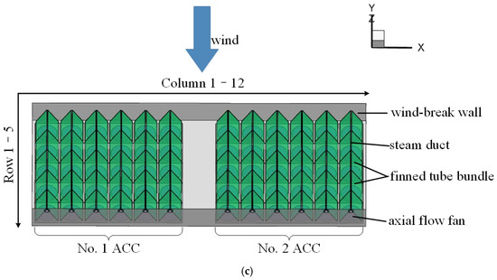 Layout of 2 × 300 MW direct dry cooling power generation unit: (a) main buildings, ACCs, and finned tube bundles; (b) ACC cell; (c) serial numbers of condenser cells.