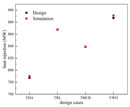 In addition, the heat rejection of several working conditions, including turbine heat acceptance (THA), turbine rated load (TRL), turbine maximum continues rate (TMCR), and valve wide open (VWO), was calculated by the method of numerical simulation. It can be seen from the comparison in Figure 4 that the results of the simulation calculation are credible.